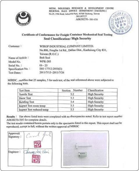 每一款「Wirop」封條均通過金屬工業研究發展中心(MIRDC)實驗室的測試,證明其拉伸荷重超過 300 公斤,符合 ISO/IEC 17712:2010 的要求。